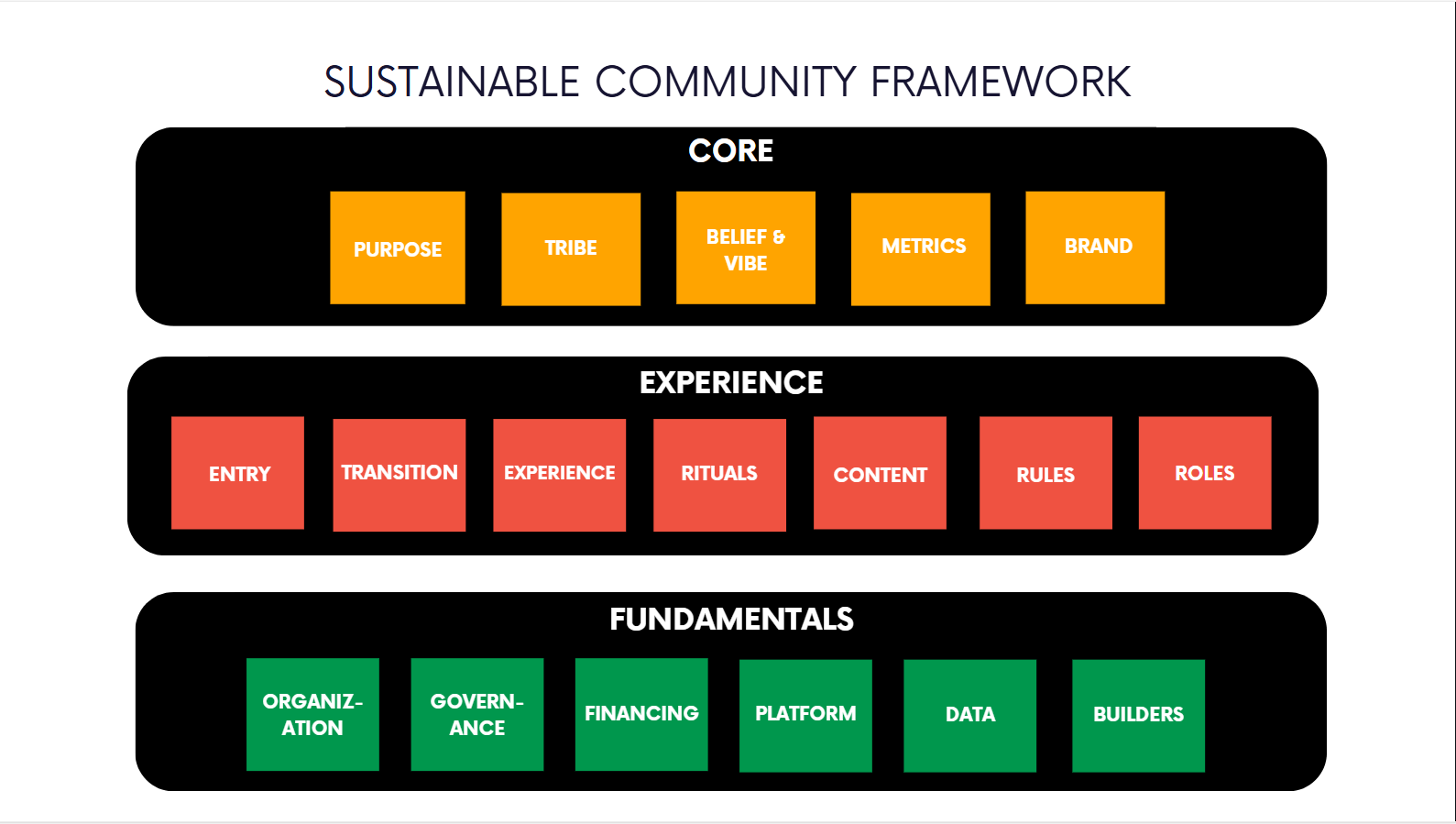 Mô hình Sustainable Community Framework này đến từ những kinh nghiệm của tôi và sự nghiên cứu các cộng đồng khách trên thế giới. Kết hợp với việc quan sát cách thức hoạt động của các cộng đồng ở Việt Nam để đúc kết lại. Tôi nghĩ rằng mô hình này sẽ hữu ích, ít nhất là cho các bạn đang muốn xây cộng đồng từ con số 0 một nền tảng để bắt đầu.