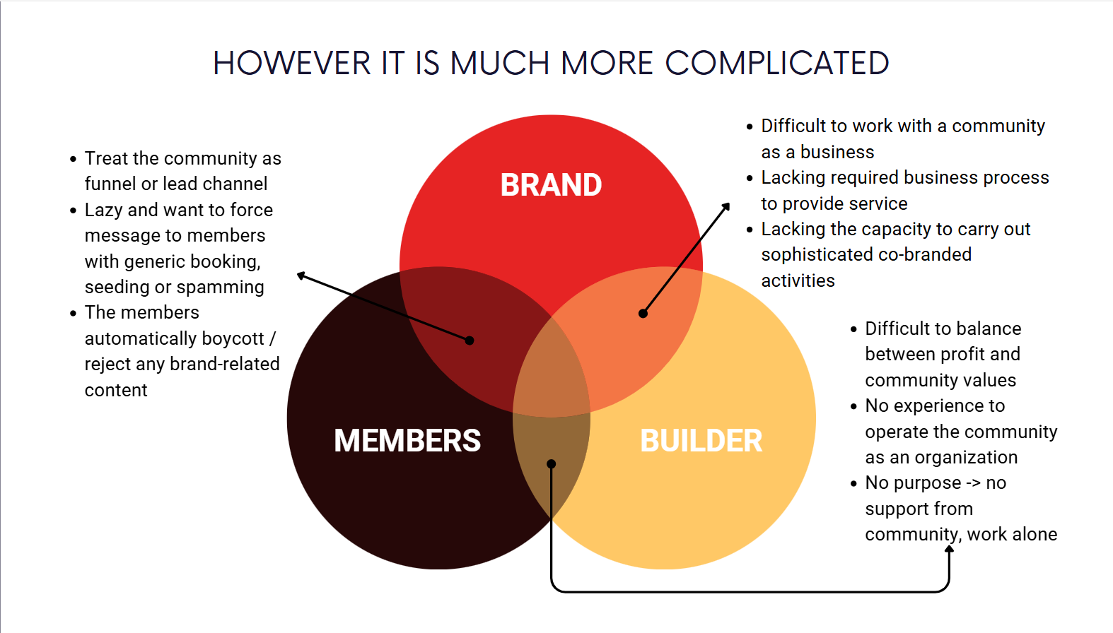 Vấn đề lớn nhất giữa Brand và Builder là từ trước tới nay, các cộng đồng đa phần được sở hữu bởi những cá nhân, sẽ rất khó để Brand có thể hợp tác và làm việc với người sở hữu cộng đồng đó như với một doanh nghiệp.