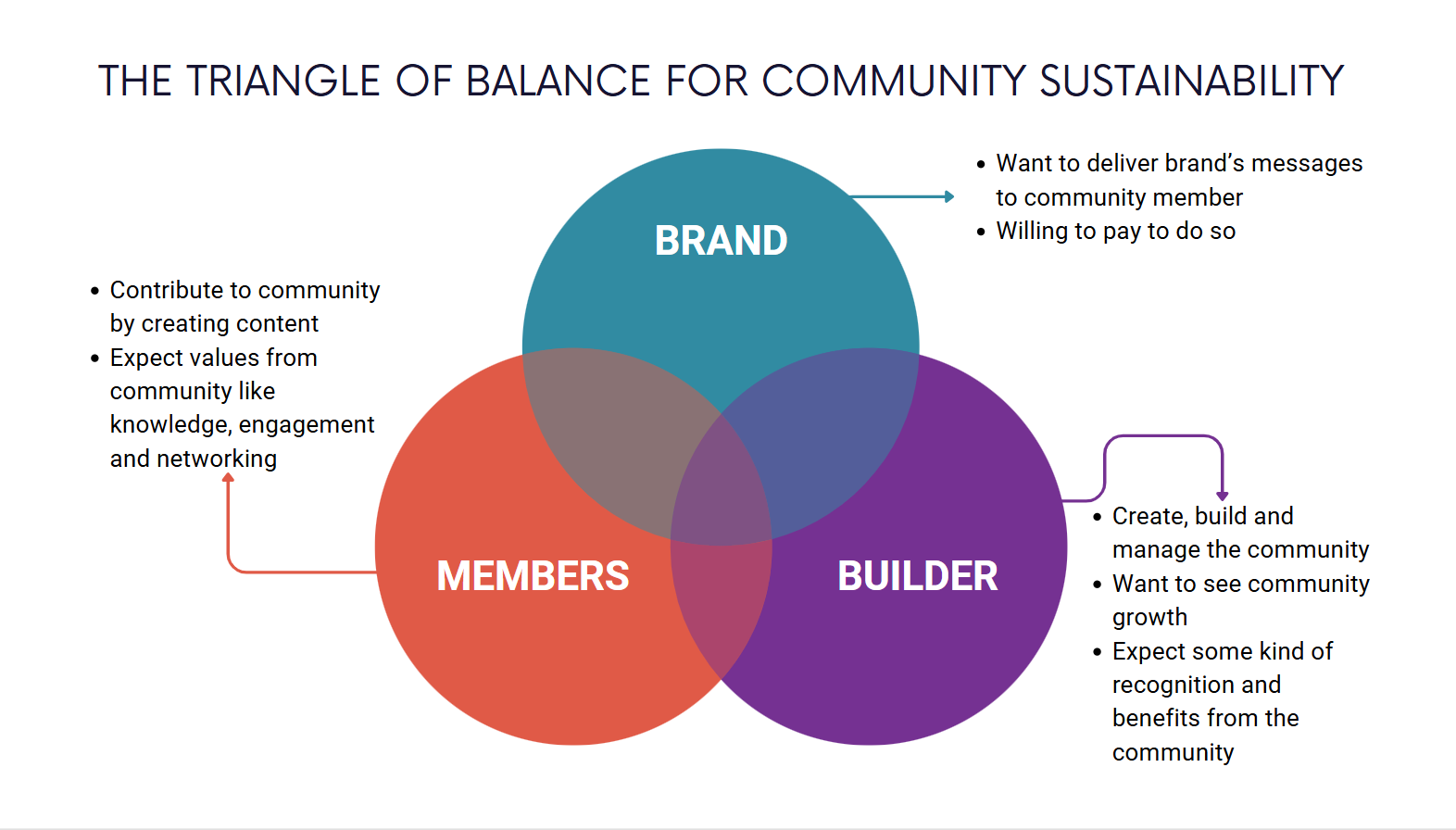 Hy vọng với những chia sẻ này, mọi người có thể thấy được một số đặc trưng và điểm mâu thuẫn giữa ba nhóm đối tượng. Từ đó chúng ta tìm được phương thức để dung hòa lợi ích của ba nhóm, giúp đạt được mô hình cộng đồng bền vững về mặt tài chính. Để xây dựng mối quan hệ Win-win cho tam giác cân bằng ba đối tượng: Brand có thể truyền tải và thực hiện những hoạt động hiệu quả hơn với các cộng đồng, Builder có thể tạo được doanh thu, lợi nhuận, giá trị cho bản thân và cũng như cho cộng đồng của họ, Member nhận thêm nhiều nội dung giá trị và cộng đồng mà họ yêu thích sẽ càng ngày càng phát triển.